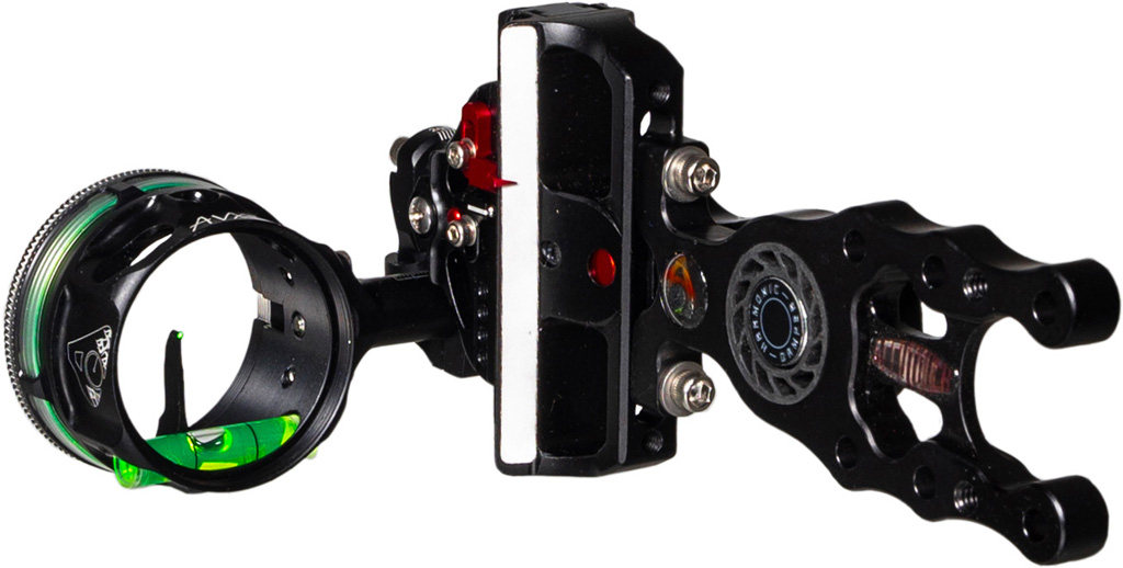 Single pin adjustable sight features Accu-Click system which allows the shooter to set ?clicks? at desired distances. As the sight elevation is adjusted, it will stop at those specified distances. A 45 degree facing sight tape makes it easier for the shooter to see where the yardage indicator is set. 1st, 2nd, and 3rd axis adjustments can be made without the use of shims. Micro adjust windage is locked into place until the Windage Lock Button is disengaged. Includes Axcel AV-31 scope (1 3/8? diameter) with either a .019? or .010? green pin. HD versions are equipped with a Harmonic Dampener in the mounting bracket.