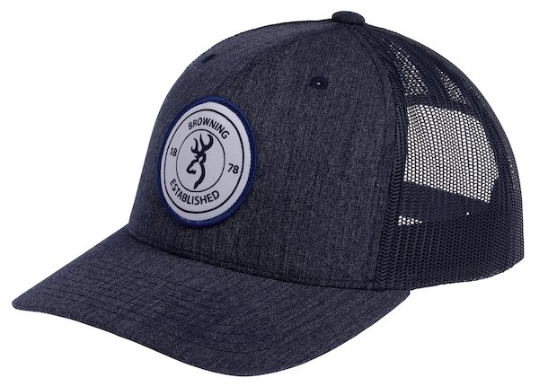 Blue, mesh back, adjustable snap closure, mid-profile crown