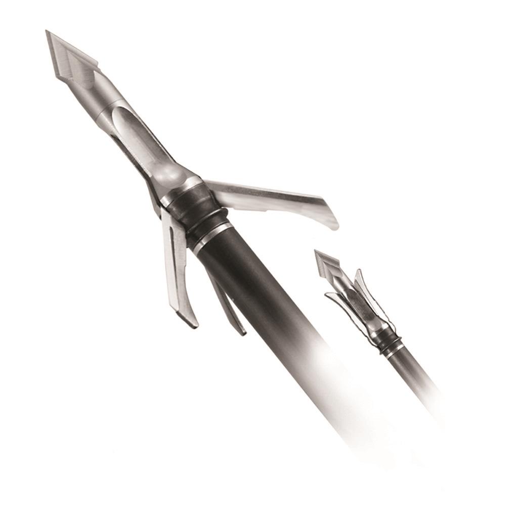 Three blade mechanical broadhead with aircraft-grade aluminum ferrule and .035″” thick blades. Features a cut on contact tip. Includes practice head.
