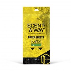 Prevent static cling in your hunting clothes while giving them a fresh-earth cover scent. Scent-A-Way Max Fresh Earth Dryer Sheets work on all fabrics and leave no residue in the dryer. The re-sealable pack includes 15 qty 6.5? x 9? sheets.