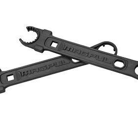 American-made, solid steel construction with grip-enhancing phosphate finish engages both stock and pin-style barrel nuts. Fits standard sized flash hiders. Installs and removes rifle receiver extensions and carbine castle nuts, with extended teeth for use with ASAP plates. Two hammer faces. Works with 1/2″ torque wrench, relevant torque specifications included on Wrench for quick reference. Convenient Bottle Opener for refreshments after the build is complete (fits both Metric and SAE bottle caps.) Made in U.S.A.