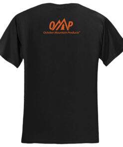 October Mountain Bucks Tee shirt. Black cotton blend with white logo on front and orange logo on back.