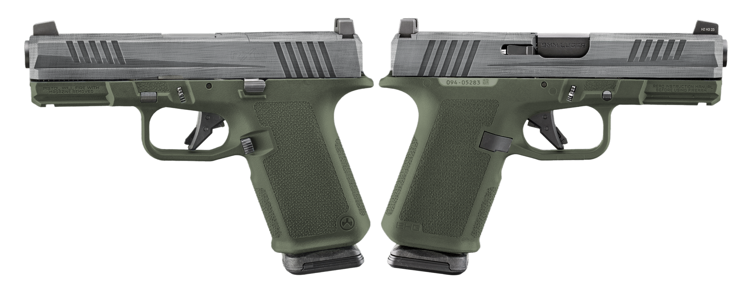 RUGER RXM 9MM PISTOL 4″ CRUSHED SILVER BATTLE WORN/GREEN O.R. 2-15RD MAGS – ORION EXCLUSIVE