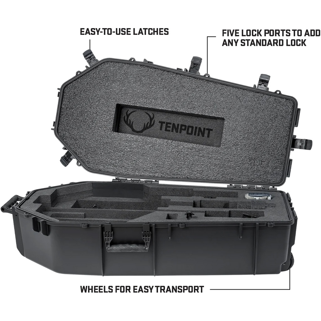 The TenPoint Hard Case offers ultimate protection and convenience for transporting your crossbow and essential gear to the field or through air travel. Constructed from rugged polypropylene copolymer, this heavy-duty case features a watertight seal, reinforced locking ports, wheels for easy rolling, and overmolded rubber handles for comfort. With CNC machined foam on the inside, it securely fits fully assembled crossbows with scopes, including rangefinding optics like the Garmin XERO X1i and Burris Oracle X. Six large interior storage areas are perfectly sized for accessories like a quiver, crank handle, rangefinder, tripod, and more. The case’s hexagonal shape reduces leg contact while carrying, and the packed case remains under 50 pounds for airline compliance.