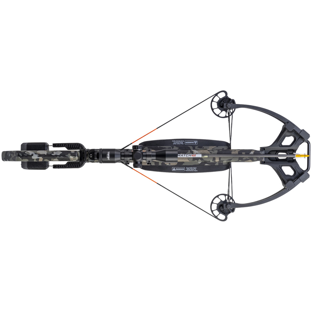 The Wicked Ridge Commander 400 is a crank-cocking crossbow built to deliver speeds up to 400 fps with consistent accuracy. It features an increased power stroke and an 11-inch narrow bow assembly with the MDX Cam system to enhance cam rotation and performance. A built-in ACUdraw crank cocking device and integrated crank handle reduce draw effort to 5 lbs without using a clamp-on unit. Package includes a Pro-View 400 lighted scope with 70-yard aimpoints, three Match 400 carbon arrows, and a quiver.